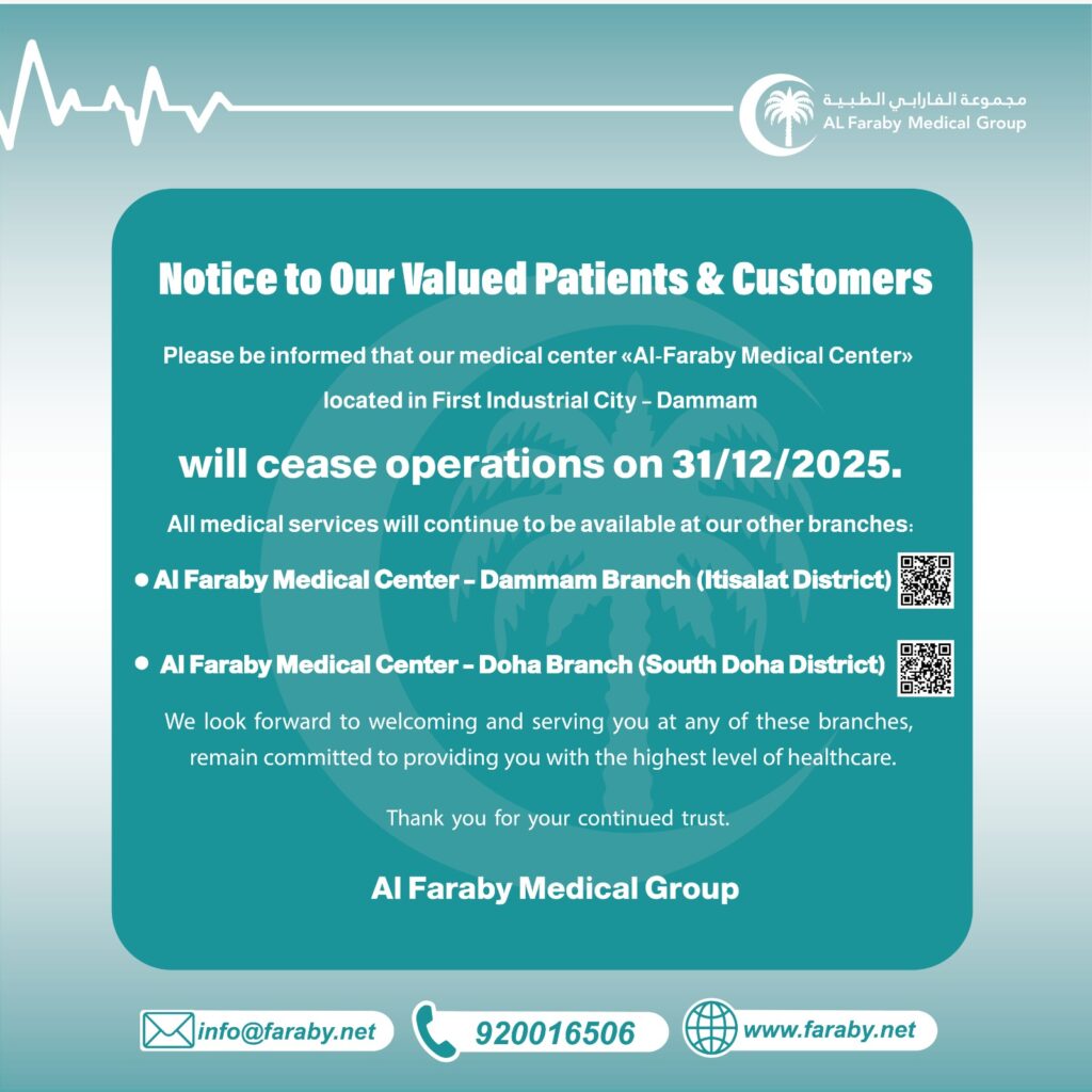 Please be informed that our medical center Al-FarabyMedical Center located in First Industrial City – Dammam will cease operations on 31/12/2025.